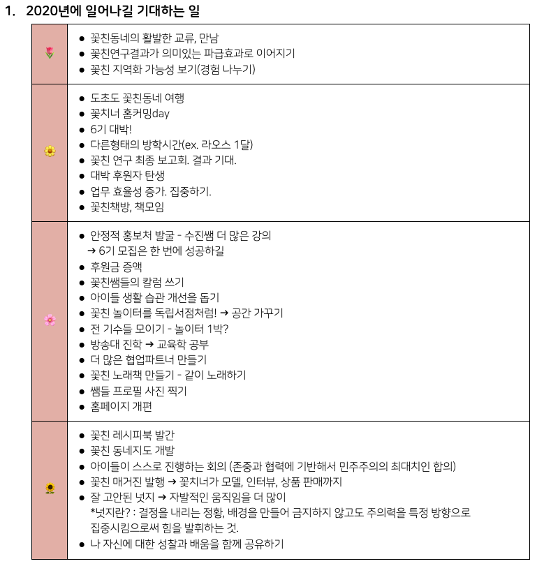 다음 날 아침에는 지난 밤에 나누었던 이야기들을 토대로 올해 꽃친에서 이루어지기 바라는 것을 적어보았습니다.