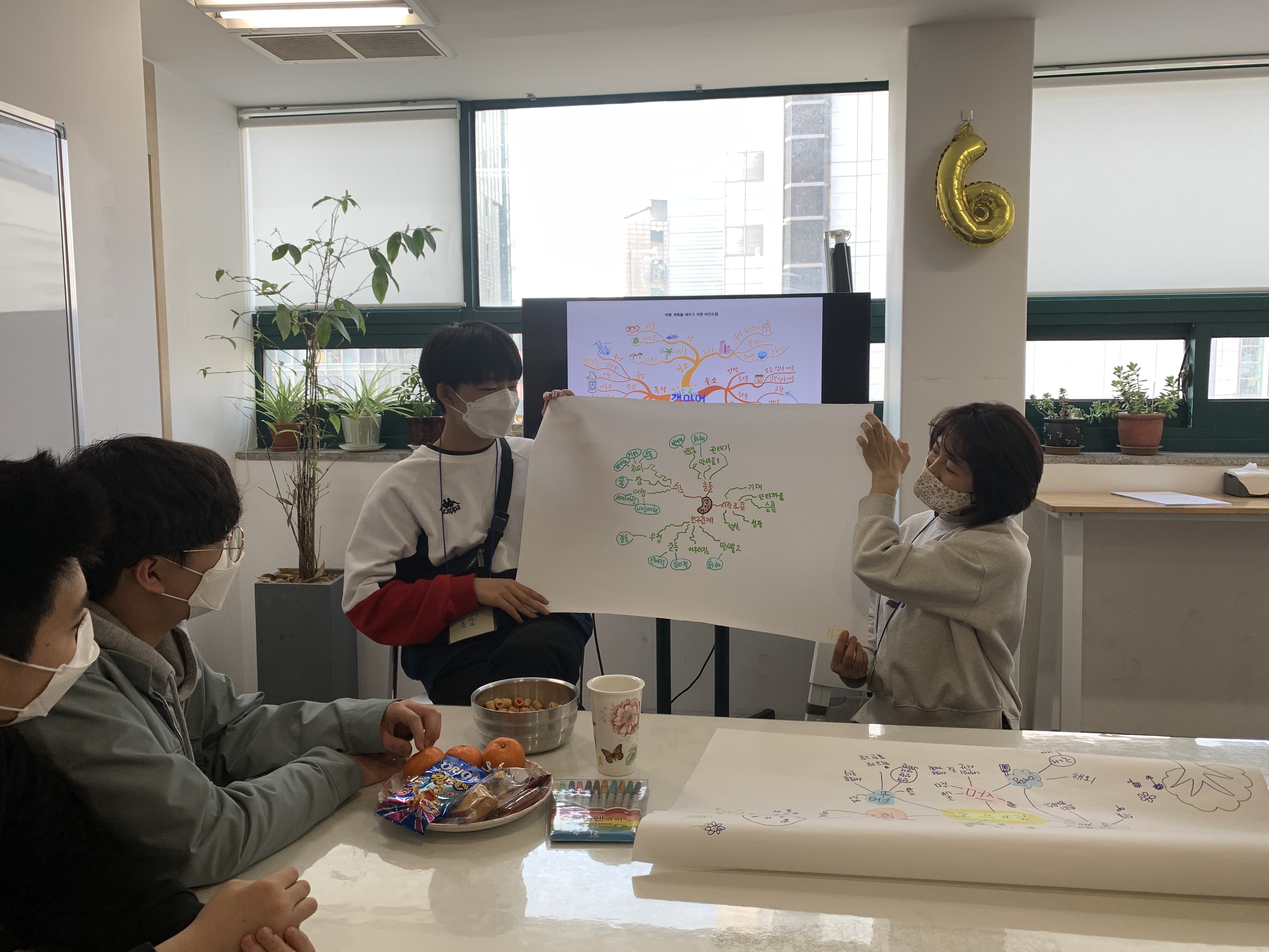 오후에는 꽃친에 대해서 좀 더 알아가는 시간을 가졌어요. 커몬이 준비한 '꽃친의 의미와 전세계의 청소년 갭이어' 발표를 듣고 나서 조별로 갭이어라는 키워드를 가지고 마인드맵을 그려 보았습니다. 6기 꽃치너들이 생각하는 갭이어는 어떤 것일까요?