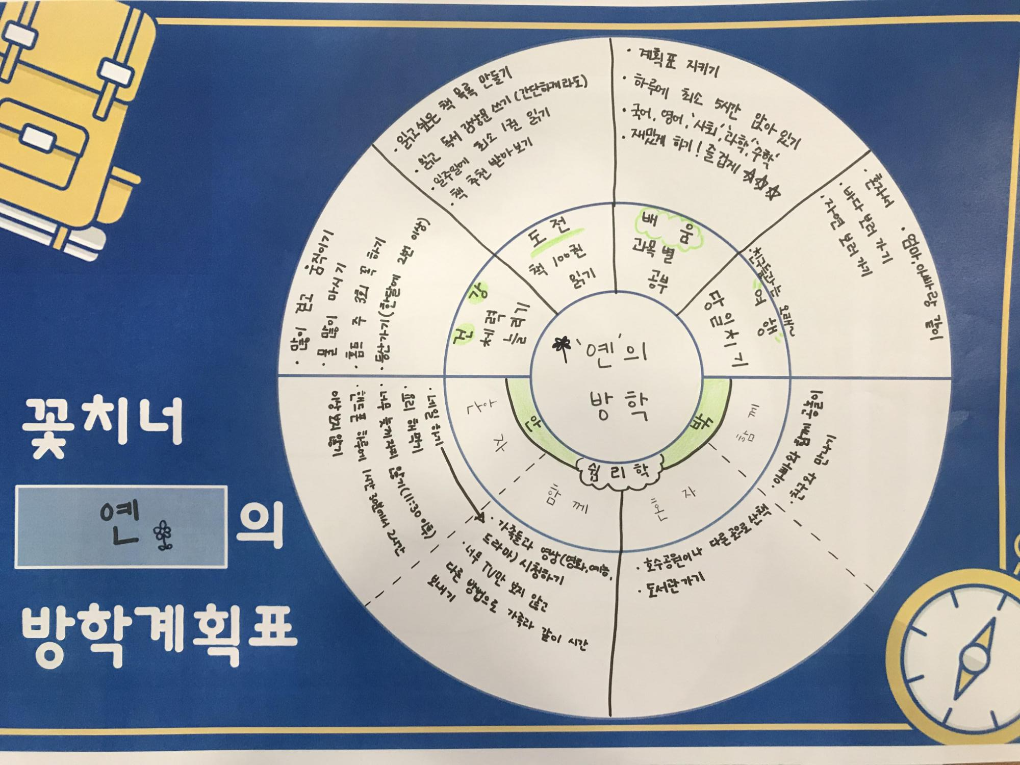 밥을 먹고 긴 산책까지 마치고 돌아와 오후에 한 일은?! 바로 방학생활계획표 만들기입니다. 방학 동안 해보고 싶은 일들을 카테고리 별로 생각해보고 나만의 계획표를 만들었어요~ 생활계획표라고 하면 하루 24시간을 파이 쪼개듯이 쪼개어서 빽빽하게 할 일을 채운 계획표를 생각하시겠지만! 꽃친의 계획표는 다릅니다. 꽃친은 '쉼'이 있는 갭이어니까요~!