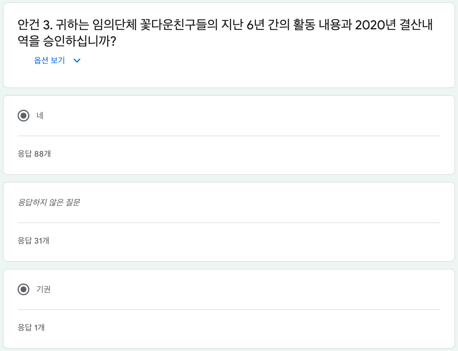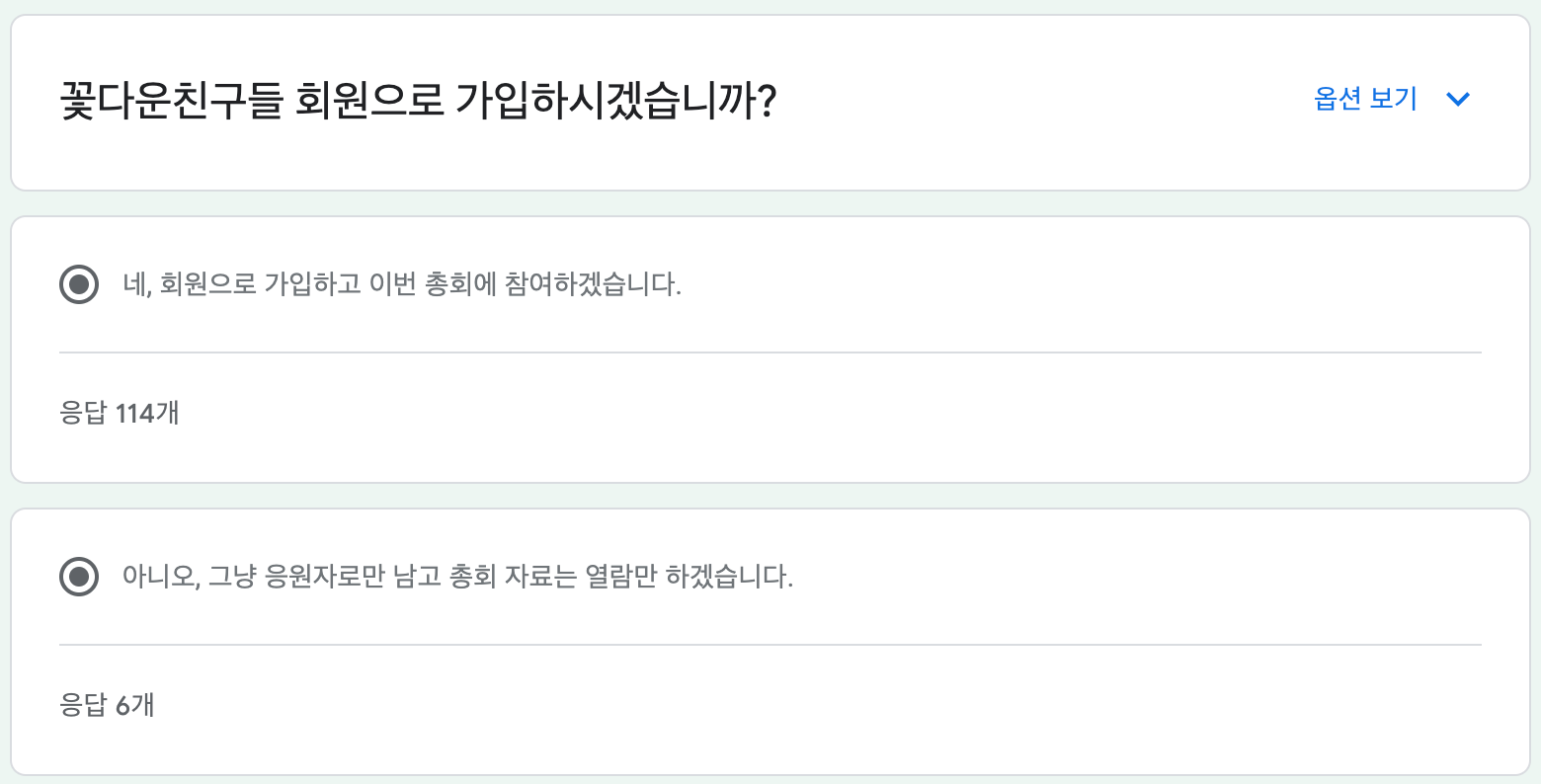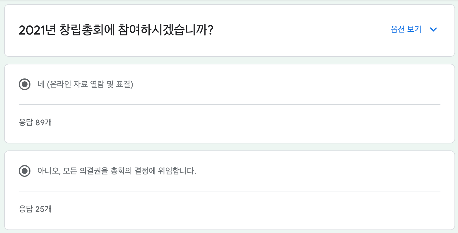 (투표자 중 2명이 총회에 중복참여 했고, 모든 안결에 찬성으로 투표하였으므로 캡쳐에서 보이는 찬성 표에서 2표를 빼고 기록함.)
