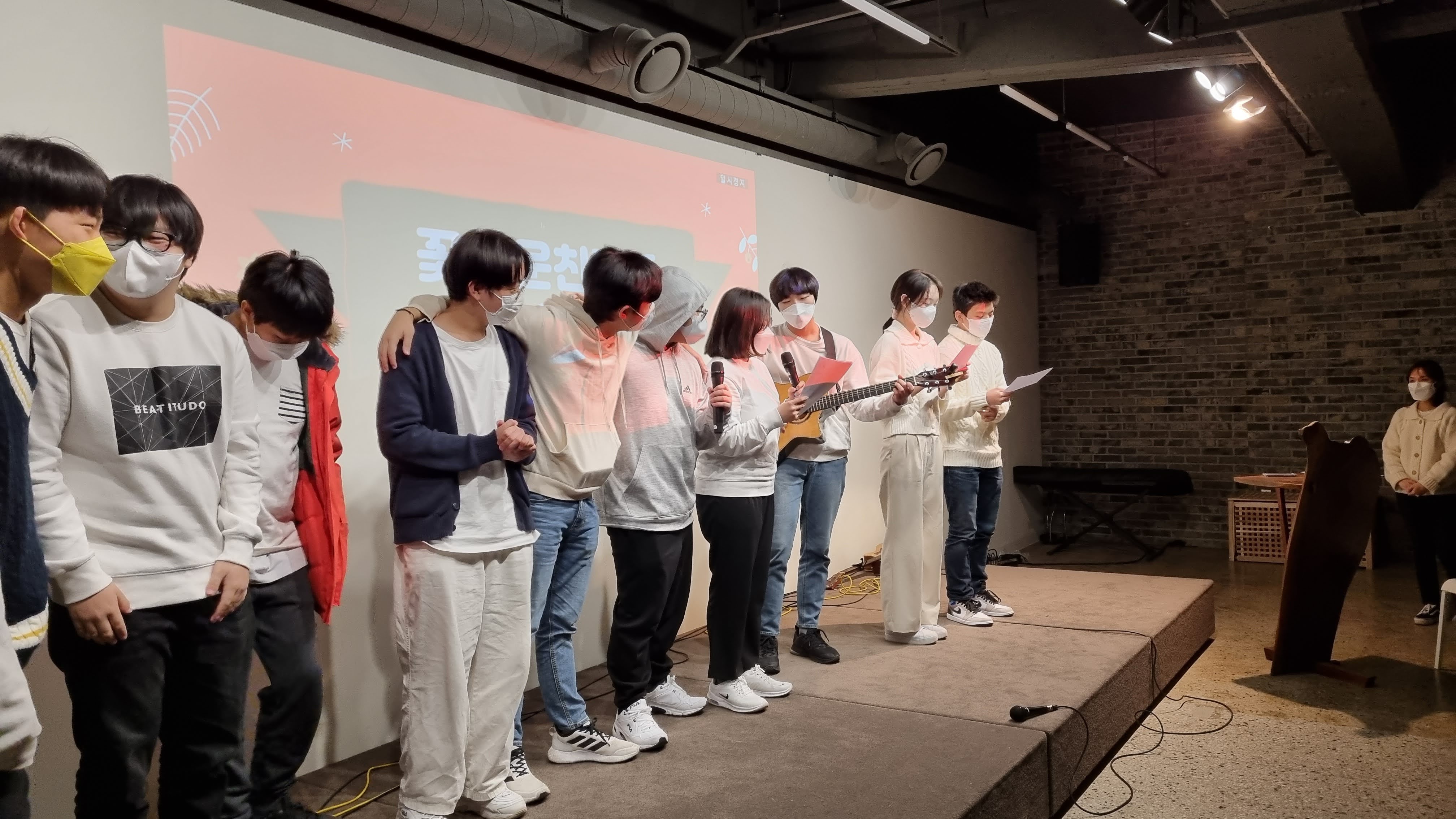 팀이름이 '던이의 기타교실'이라서 진짜 기타수업을 운영했나 생각할 텐데 던이의 기타교실은 6기 꽃치너들만의 비공식 시간(?)이었답니다. 상반기부터 던이가 친구들에게 기타를 가르쳐주고, 연습하면서 시작되었어요. 꽃친 놀이터에서의 점심시간마다 기타 소리가 끊이질 않아서 꽃친쌤들이 "안녕식에 공연해야겠다"라고 했던 말이 현실로 이뤄진 날이었죠.
