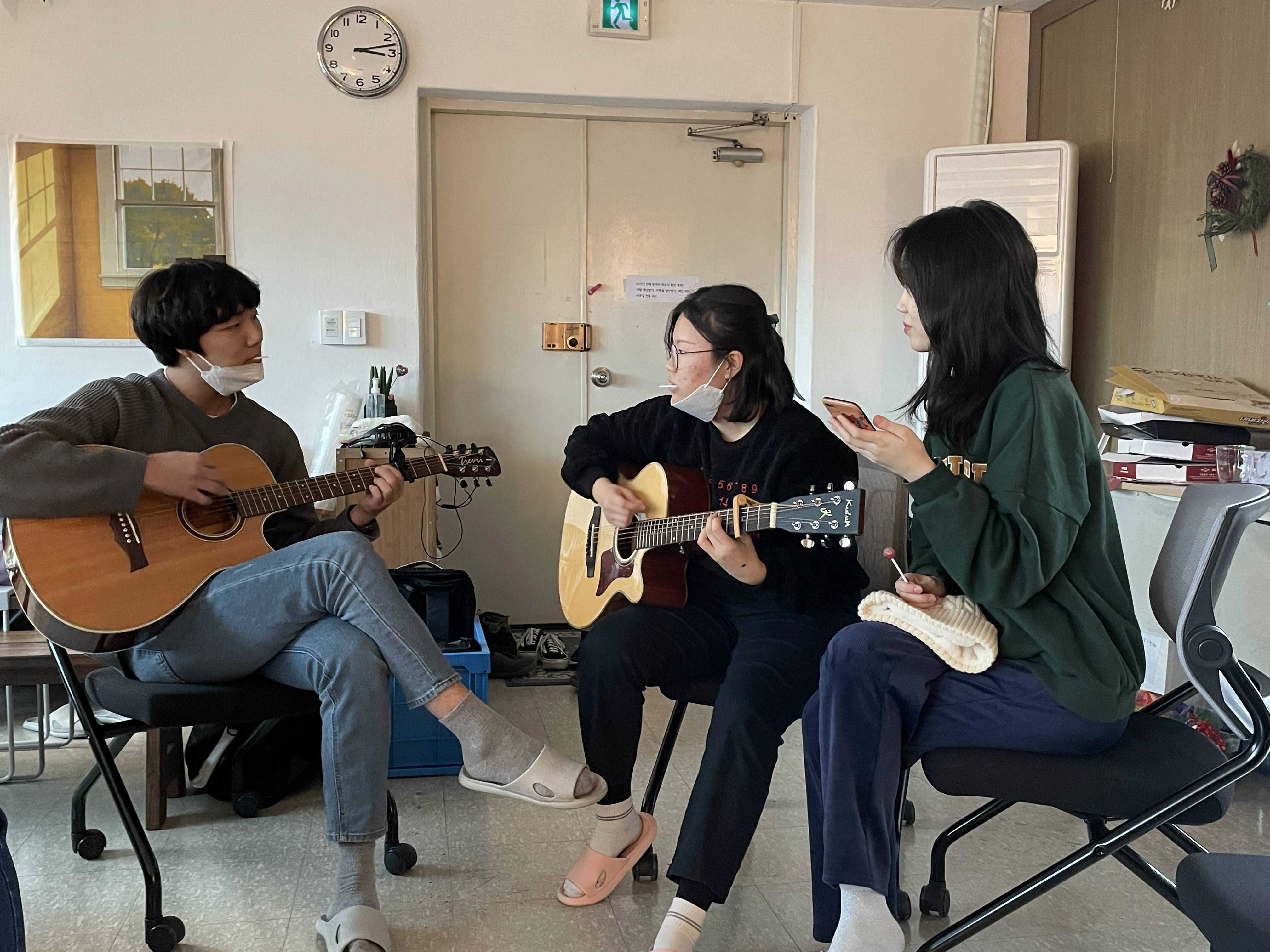 기타를 전혀 치지 못했던 옌이는 1년 동안 던이가 알려준 코드로 연습한 곡을 선보였습니다. 개인 방학 시간동안 보컬 수업을 들었던 즌즌이가 기타 연주와 어울리는 목소리로 노래도 불러주었어요. 자유시간 동안 기타로 놀면서 이렇게 예술적 결과물을 보여준 친구들 넘 멋져요~!